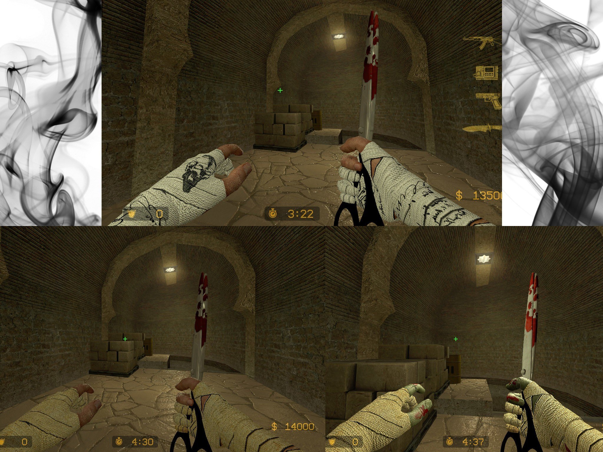 | Добавил: The DSystem 2016-04-09 14:23:27 71 view Just choose your style and simply replace the "cstrike" folder... This is Bandaged hands (HD pack), i've used HD bandage texture... Iwncludes "Bandaged hands", "Bandaged hands with signatures" and "Mummy hands" with UGLY greeeen skin :D have fun guis, i've added phong, and boost, if you want remove it from "v_hands.vmt" may be you'll like it without phong... rate, comment :)
