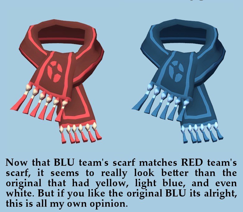 | Добавил: The DSystem 2016-04-10 01:39:01 43 views I never liked blue team's scarf because it was a different style in colors, not just blue. It had like yellow, and white, which looked okay, but this is a better style in my own opinion because it seems to suit the characters better. A simple skin that can really make your characters look good!