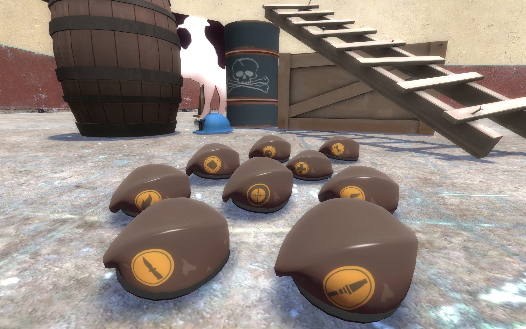 Alright. I recompiled (and applied fixes, because recompiling breaks stuff) ALL Bill's Berets for each class so they have separate texture files. Of course, I made the new textures as well so they now bear the class logo.