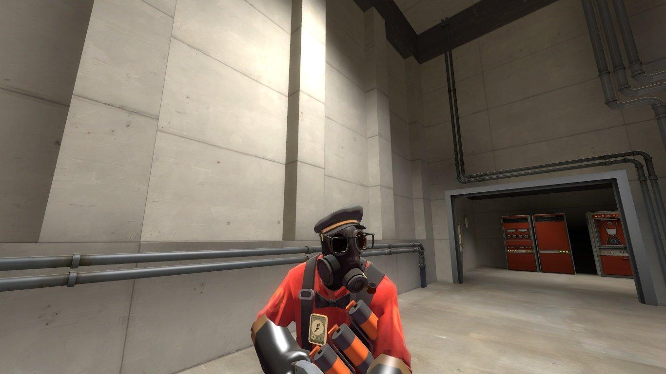 This is a skin for the Whiskered Gentleman, the pyro's misc. item. It features old-style glasses and a pipe taped to the gas mask.