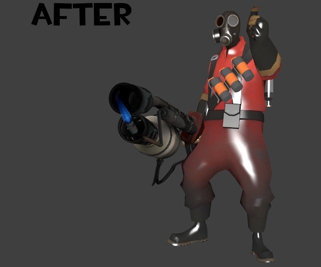 The default flamethrower model has a rather odd bone structure; its hose is attached to weapon-bone-L. Most of his animations compensate for this, an exception being his gestures, which stretch the hose up to his left hand. This skin will fix that, as well as adds a jigglebone to the hose.