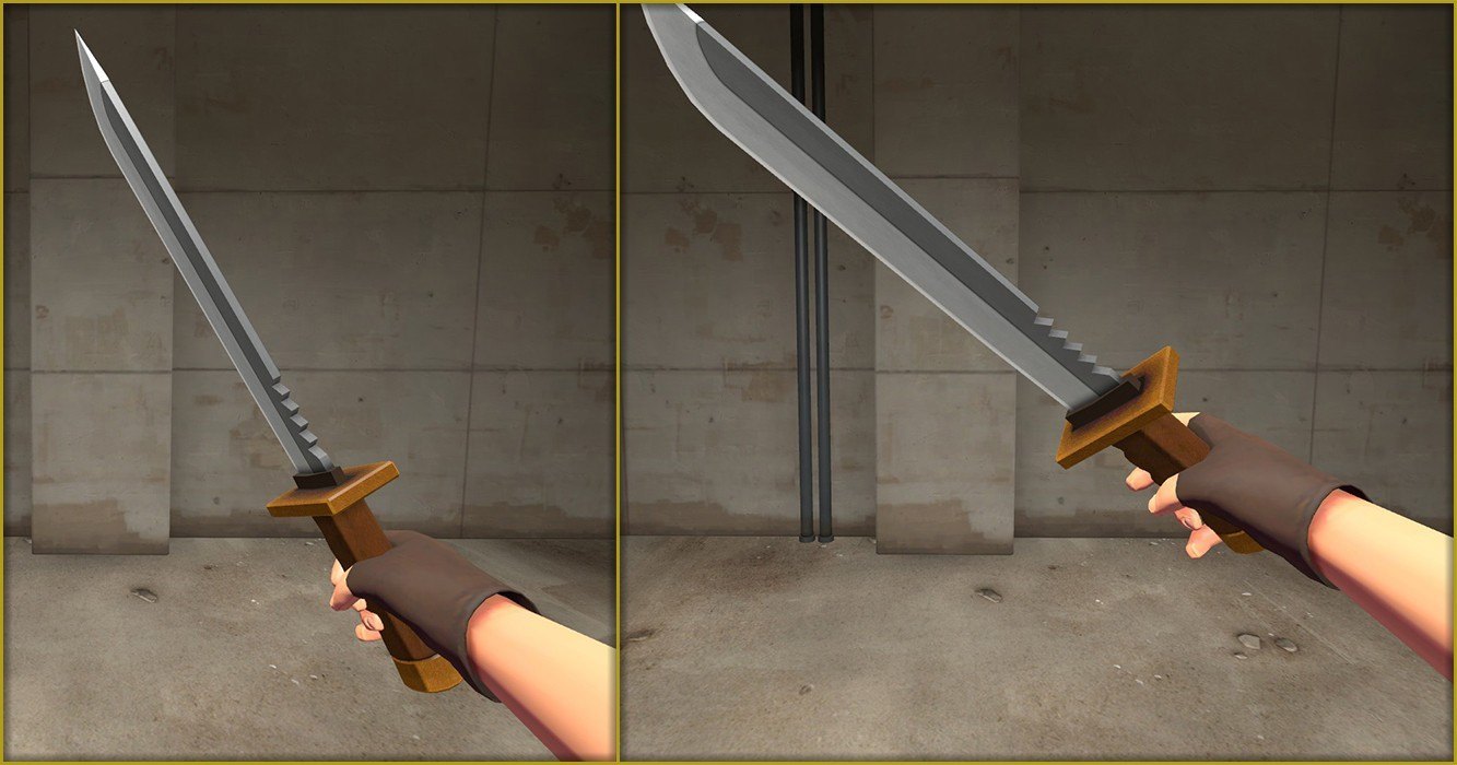 I modified the model so it would correctly fit the sniper's hand in first and third person, made it bigger and made the blade longer. I also completely retextured it, the original texture was only 256x256 so making it 1024x1024 without improving it would result in a pixelated mess.