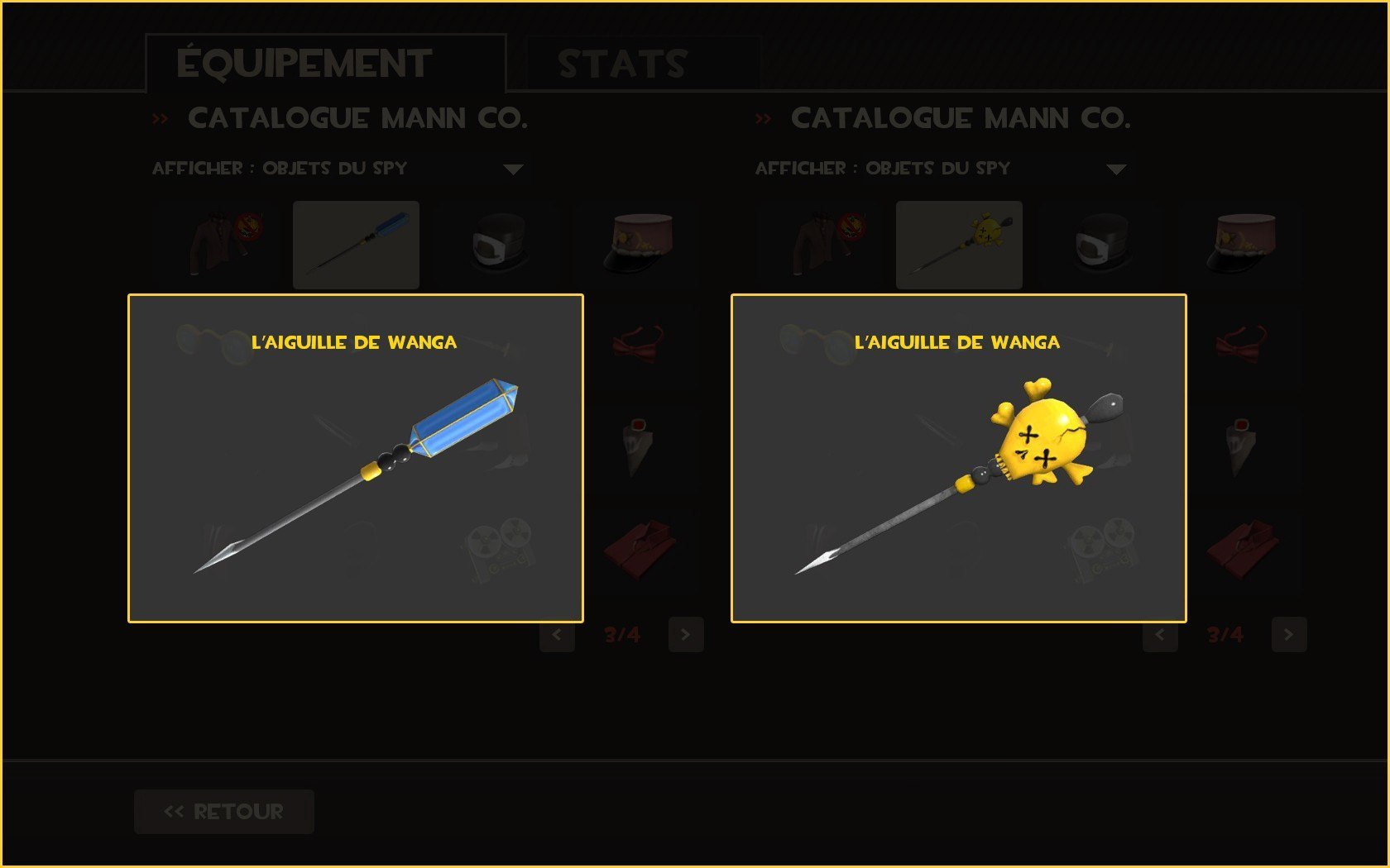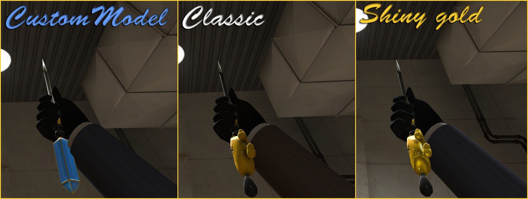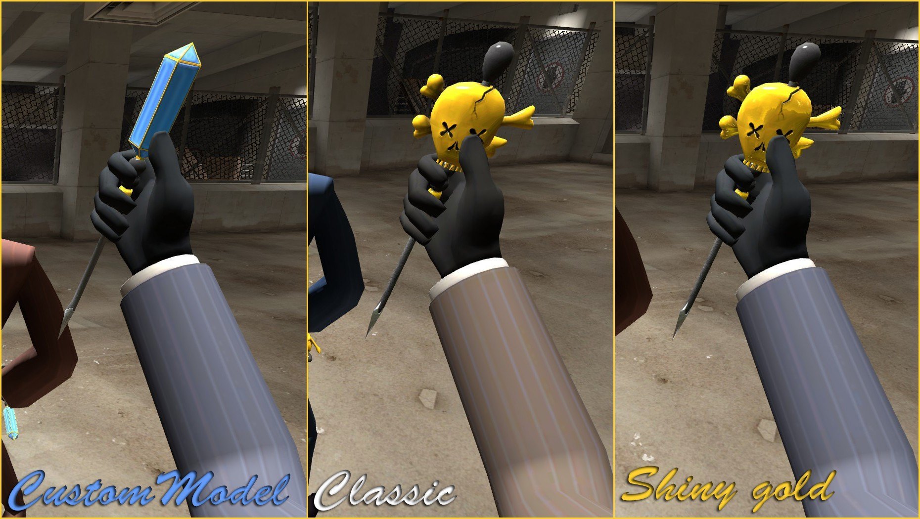 Two Stylish versions of the Wanga Prick : the usual Classic/Shiny gold choice, with new textures, normal map and backpack/HUD icons, and a "custom" model (default model with a diamond instead of the skull) with its own normal map, custom texture and backpack/HUD icons as well.